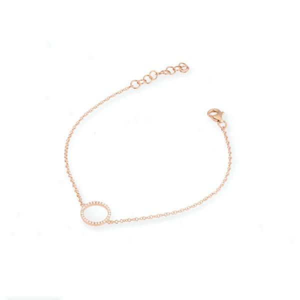 This bracelet features a fine rose-gold chain centred around a circular motif set with a continuous row of diamonds. The open circle forms a defined geometric element, with each diamond placed along the outer edge to create a consistent perimeter. The chain remains minimal, allowing the circular form to hold visual emphasis while maintaining a light, uninterrupted line around the wrist.