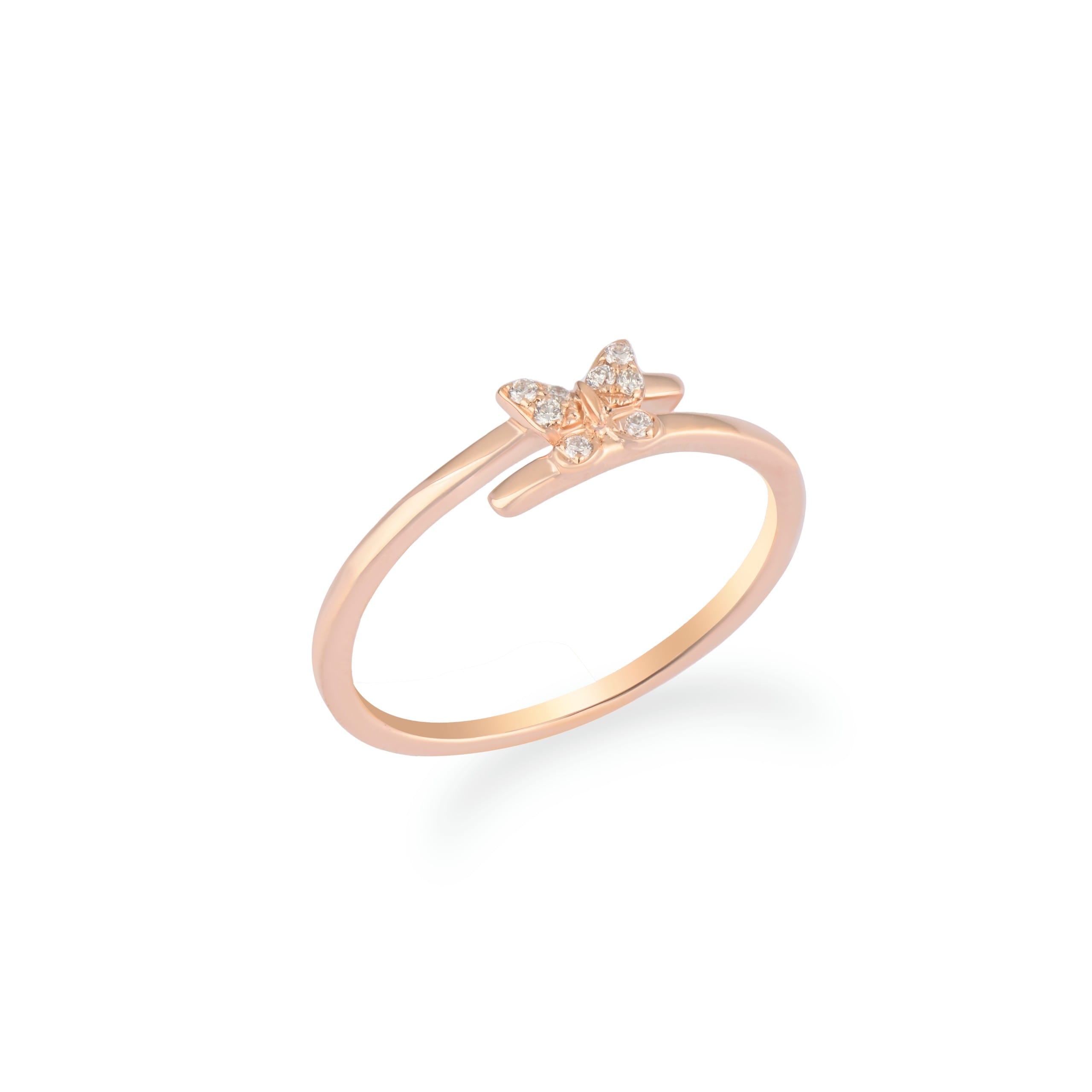 This ring features a slender rose-gold band topped with a butterfly motif formed from diamond-set wings. Each wing is composed of small round diamonds arranged within softly curved outlines, creating a balanced four-wing form centred on the band. The butterfly sits slightly elevated above the surface, allowing the individual diamond settings to remain clearly defined.