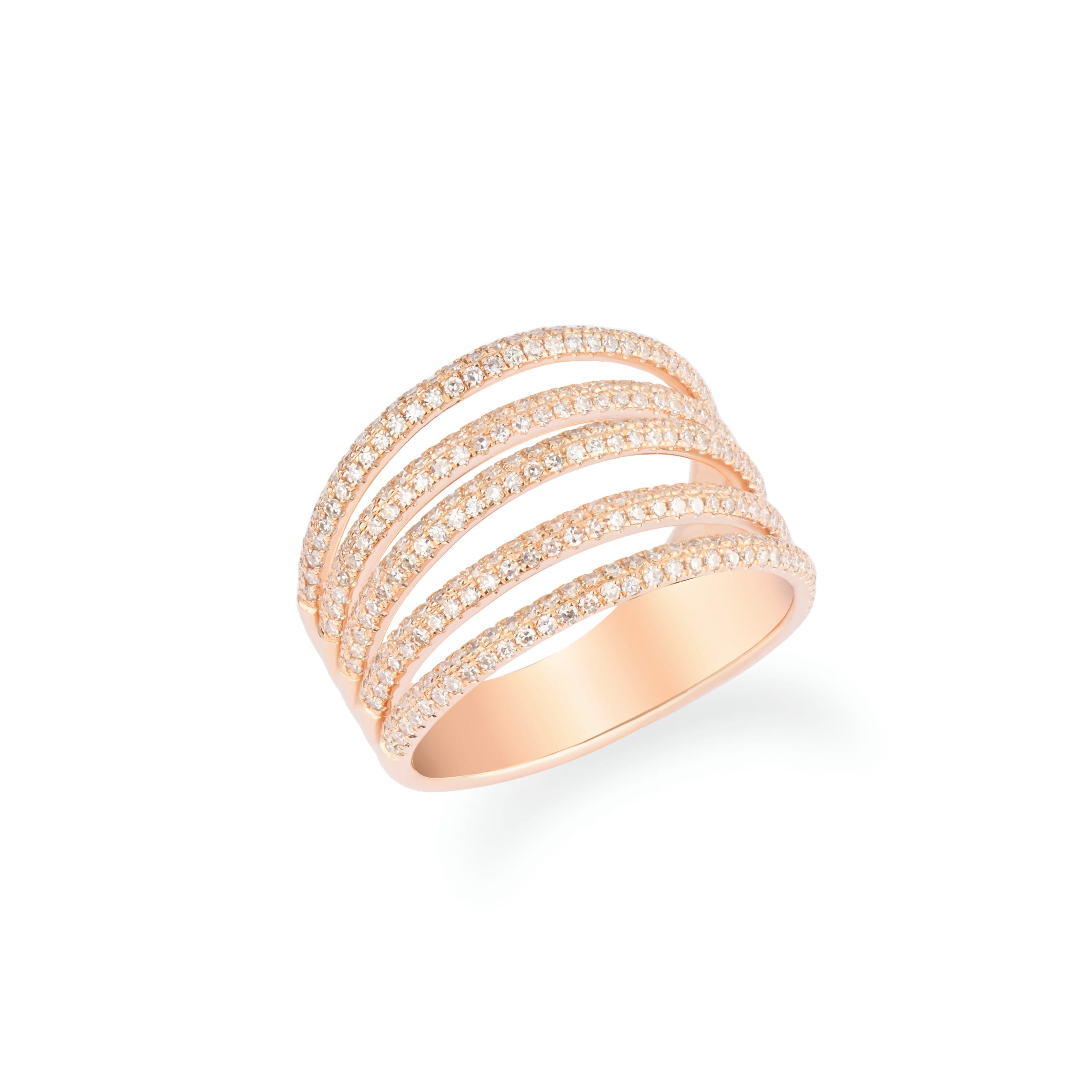 This ring features a wide rose-gold band composed of several parallel diamond-set arcs arranged across the finger. Each curved strand is lined with pavé-set diamonds, forming successive rows that follow a consistent sweep across the surface. The layered arrangement creates a structured composition defined by repeated lines of closely set stones.