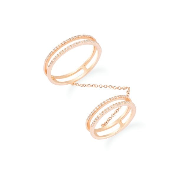 This sculptural design features two open rose-gold bands positioned parallel across the finger, connected by a fine chain that introduces movement between the forms. Each band is accented with a single row of pavé-set diamonds along its upper edge, creating a measured line of light against the warm tone of the metal. The negative space within each ring enhances the linear composition and reinforces the piece’s structured silhouette.