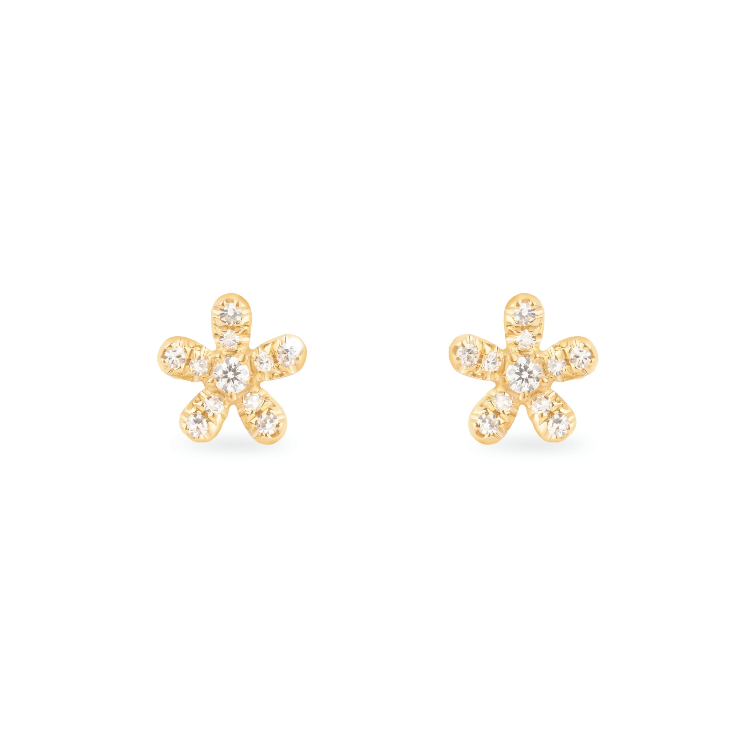 A five-petal blossom rendered in 14KT yellow gold, each petal pavé-set with bright diamonds and centred on a single round brilliant stone. The warm gold catches the light along its rounded edges while the diamonds bring quiet sparkle to the face. Small in scale and bright in finish, these studs draw on the floral motifs found across Sri Lankan goldsmithing, from the frangipani to the temple gardens. A pair to wear from morning meetings to evening dinners. Refined, feminine, and made to slip into daily life.