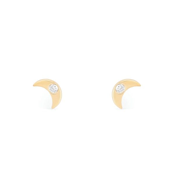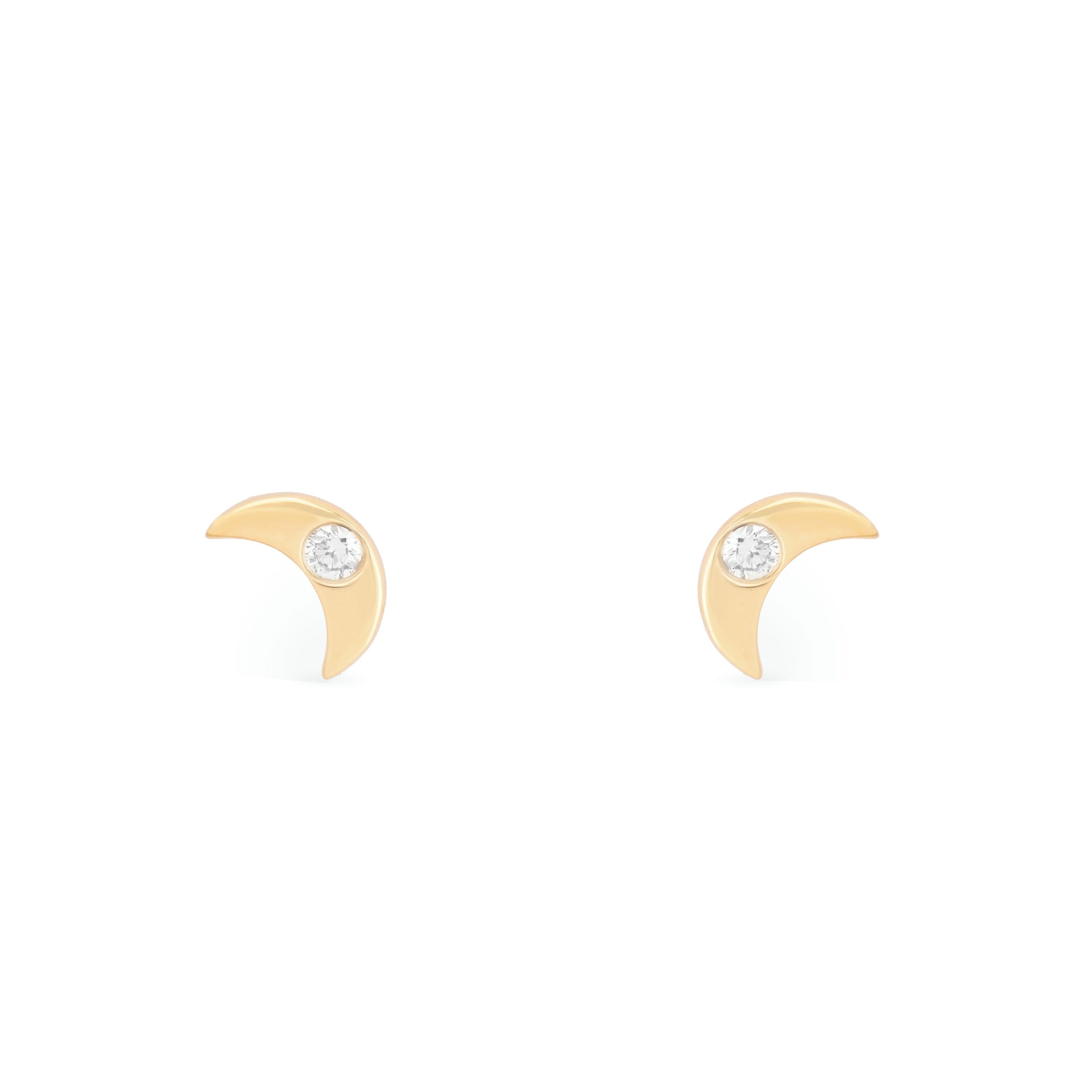 A crescent moon shaped in polished 14KT yellow gold, set with a single round brilliant diamond at the inner curve. The bezel holds the stone close to the surface so the gold and the diamond catch the light together. Slim and tapered to fine points, the silhouette mirrors across the pair, framing the face with quiet symmetry. A piece for the woman who keeps her own hours.