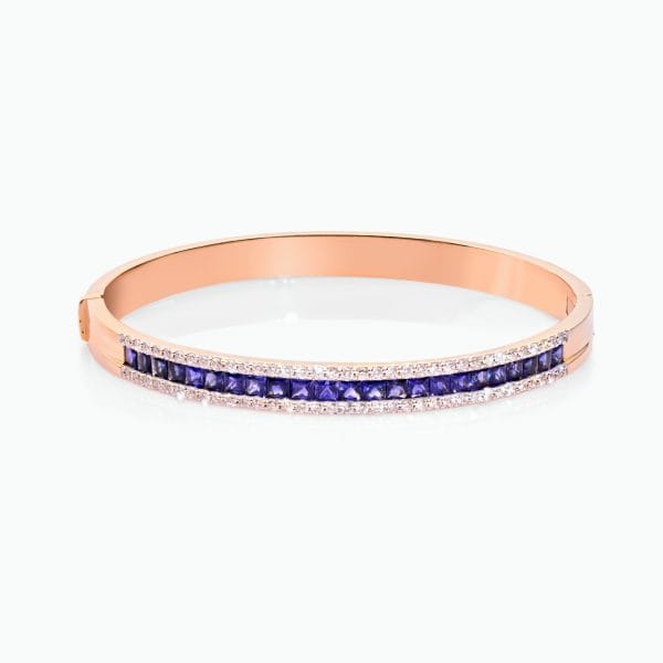 Crafted in 18 karat rose gold, the bangle maintains a rigid circular form with a smooth, polished interior. The contrast between the blue sapphires and the surrounding diamonds establishes a clear separation of colour and texture across the surface. The straight alignment of the stones reinforces the bangle’s structured composition while keeping the design balanced across its width.