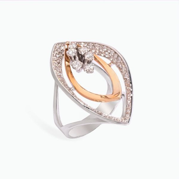 At the centre, a cluster of diamonds rises above the intersecting forms, arranged in a compact grouping that contrasts with the surrounding open structure. The band supports the upper composition through a split form, allowing the layered elements to remain elevated while maintaining balance. The combination of white and rose gold establishes a clear distinction between the outer and inner forms, while the diamond settings reinforce the structured arrangement.