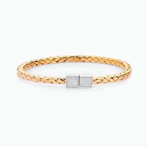 This bangle presents a woven gold structure formed by interlocking links that create a continuous, scaled pattern around the band. The surface reflects light across each individual segment, producing a consistent, repeating texture that follows the circular form. At the centre, two square settings in white gold introduce a contrasting element, each set with a cluster of diamonds arranged in a tight grid.