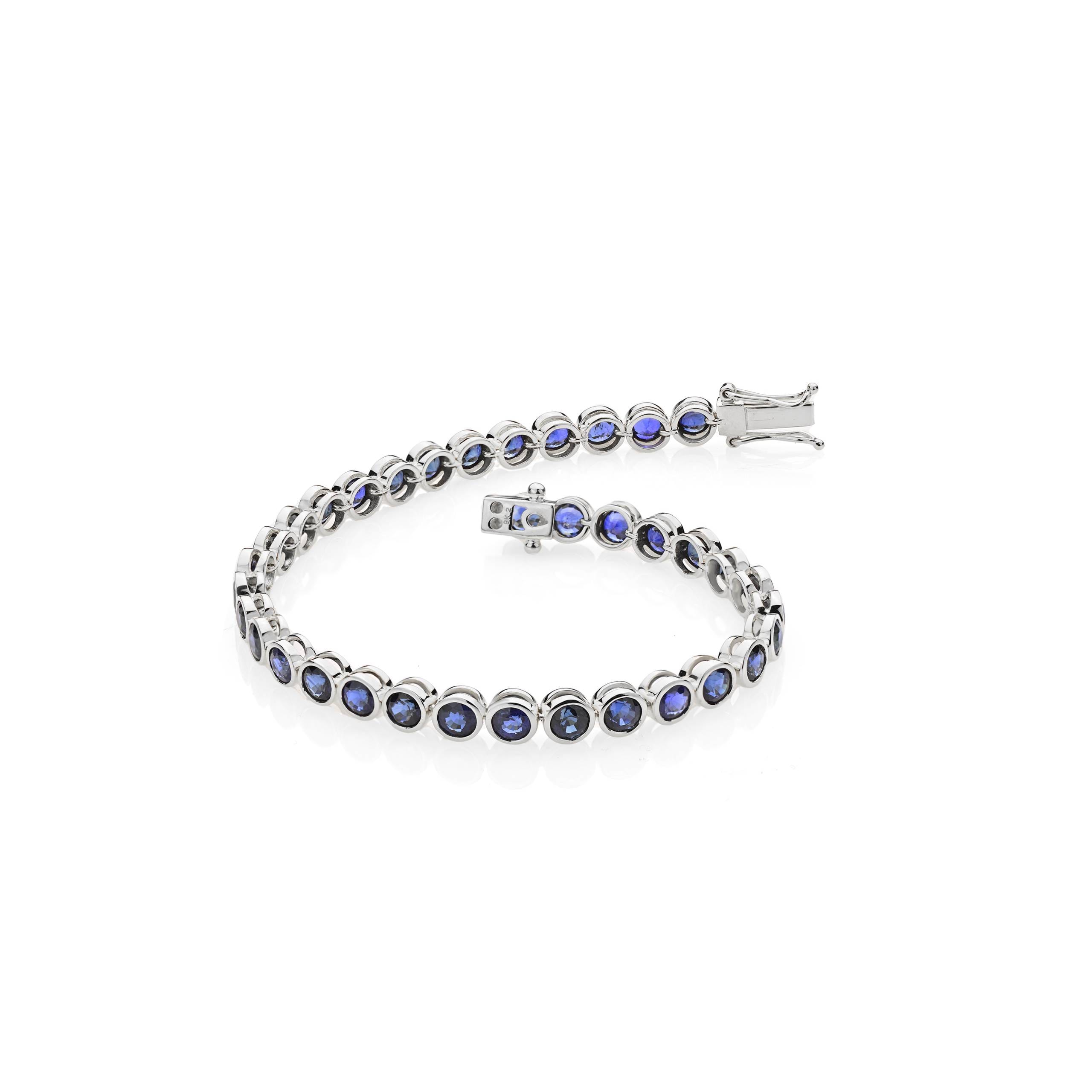Add a refined pop of color to your collection with this stunning 18KT white gold bracelet, showcasing a continuous line of vivid round-cut blue sapphires. Each sapphire is bezel-set in polished white gold, creating a sleek, modern silhouette with timeless elegance. Perfect for layering or wearing solo, this bracelet is a luxurious nod to sophistication and strength.