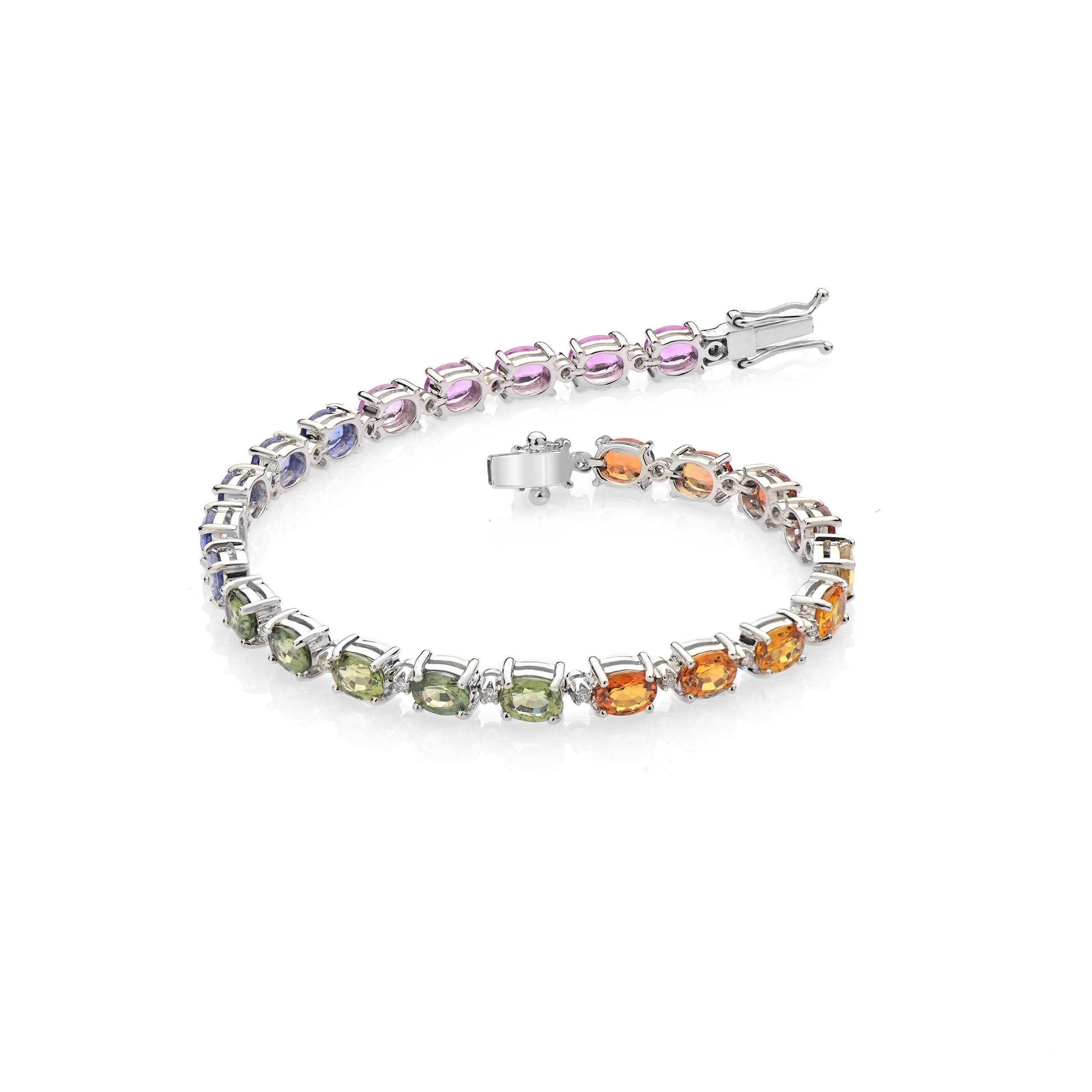 A vibrant celebration of colour and elegance, this 18KT white gold bracelet showcases a breath-taking arrangement of multi-coloured sapphires. Each oval-cut gem is delicately prong-set, forming a radiant gradient that flows from warm orange to cool blue and pink tones. Crafted with precision and secured with a double-lock clasp, this piece is a luxurious ode to individuality and timeless charm.