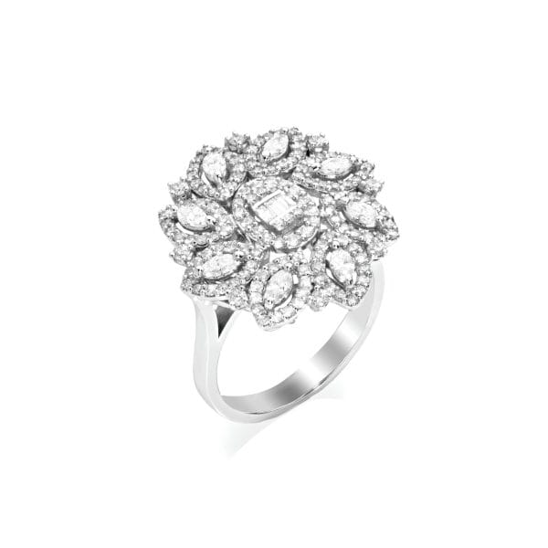 Crafted in 18 karat white gold, the setting builds height through its multi-level arrangement, with the central cluster positioned above the surrounding elements. The contrast between the geometric centre and the radiating marquise forms establishes a structured composition across the surface. The band remains smooth and tapered, supporting the upper section without adding visual weight. Designed for those who favour structured cluster designs with defined detailing, this piece reflects Tiesh’s approach to arranging diamonds through symmetry, layering and controlled placement.